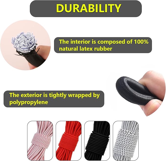 - GOOD STRETCH:The interior is composed of natural latex rubber, and the exterior is tightly wrapped by polypropylene.Our shock cord has better performance in strength,long-lasting,abrasion resistance, and durability.