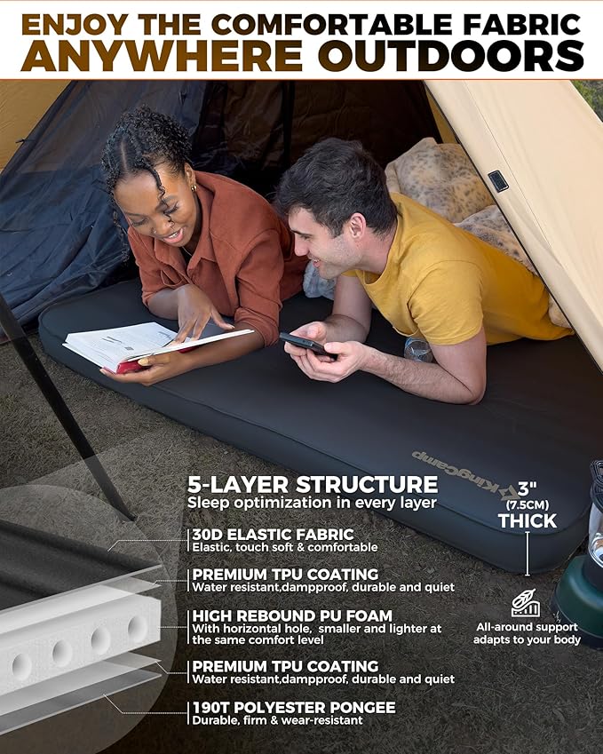 - 3D SIDE WALLS + PERFORATED FOAM TECHNOLOGY – Elevate your camping experience with 3D side walls that boost visual appeal while the horizontal perforated foam cuts weight and shrinks storage volume by 30% compared to non-perforated models. The 3-inch (7.5cm) thick structure enhances comfort, making this portable camping mat easy to carry yet supportive enough for deep, restful sleep—perfect as a self inflating sleeping mat or tent mattress.