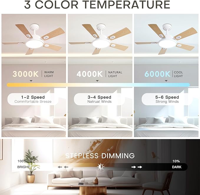 - Dimmable LED Ceiling Fan: High-quality LED light source and nano-frosted lampshade make the ceiling fan light bright and soft, flicker-free, reduce your eye strain. Customize the color temperature (3000K-6500K) and brightness (10%-100%) according to your mood and occasion. Provides a bright, soft, eye-friendly light source.