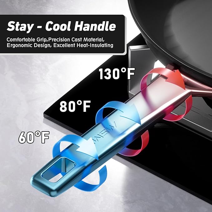 - STAY-COOL STEEL HANDLE: The small pan Y-shaped structure allows the handle to dissipate heat effectively and keep the handle cool continuously. Double-riveted for exceptional strength and maneuverability, the ceramic skillet pan empowers you to seamlessly transition from stovetop to oven.The sealed design prevents any soup or sauce from getting inside, making it easy to clean.