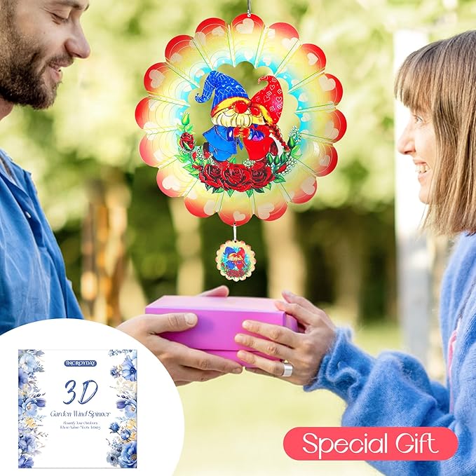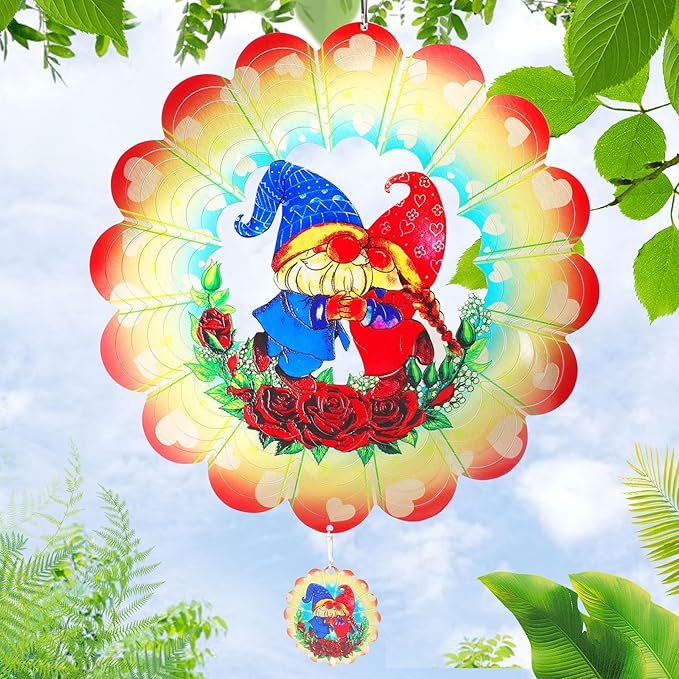 - Cute Artistic Design: Inspired by symbol of gnome, our 3D wind spinners features a vibrant and uniquely shaped gnome design. Perfect for hanging in your yard, garden, porch, patio, or any indoor/outdoor space you desire. As the gentle breeze passes, the spinning spinner creates a mesmerizing 3D visual effect with changing light patterns, making it a distinctive addition to your garden decor