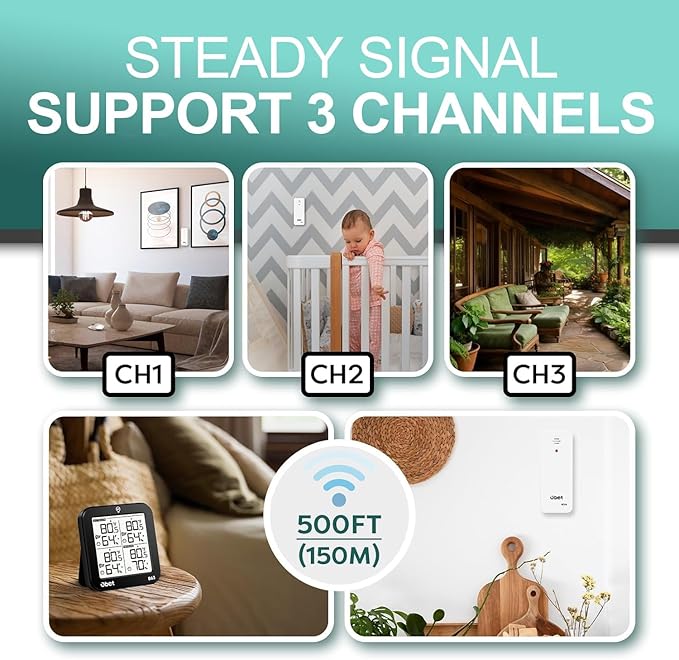 - Indoor Outdoor Thermometer with 3 Sensors: Stable signal transmission system with 3 sensors, ensuring accurate real-time readings for multiple locations. Up to 500ft (150m) long range, suitable for RV, living room, bedroom, garage, incubator or garden.