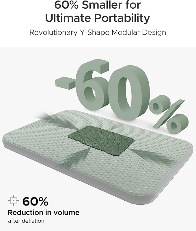 - πππ¦π¬-π§π’-π£πππ, π¨ππ§π₯π-π£π’π₯π§ππππ πππ¦πππ‘: The Y-shaped telescopic foam structure reduces bulk by up to 60% after deflationβmaking it significantly lighter and more compact than traditional foam air mattresses. Weighing just 5.3 lbs and packing down to 7" x 7" x 27", itβs easy to carry and stow on any trip