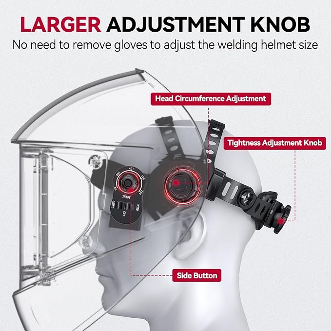 - EASIER ADJUSTMENT - The welder helmet features a newly upgraded knob section, allowing for easy adjustment even while wearing gloves. The interior of the helmet has been rearranged for a better fit to the human head, ensuring comfort even during extended wear.