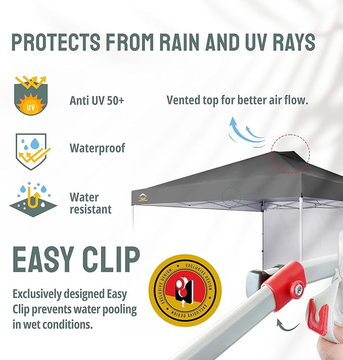 - FAST CLIP CANOPY FABRIC - The newly designed clip system makes it easy to attach the canopy fabric to the frame. The silver-coated interior provides exceptional UPF 50+ UV protection, ensuring cooler, safer shade. Made from rugged 150D fabric, the canopy is water-resistant and CPAI-84-rated for flame resistance. The canopy features integrated air vents, and the fast clip system prevents wind lift and rain pooling, reducing fabric tearing risks. Ideal for outdoor events, weddings, and gatherings.