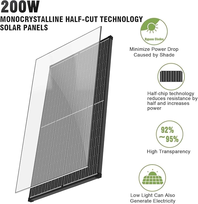 - 25% High Conversion Rate: This 400W solar panel (200w 2 PCS) with monocrystalline A+ solar cell has an excellent cell efficiency of 24%-30%. This makes the solar panel last longer. Generates an average of 1000 watt-hours (Wh) of electricity per day (Depending on light and usage conditions)