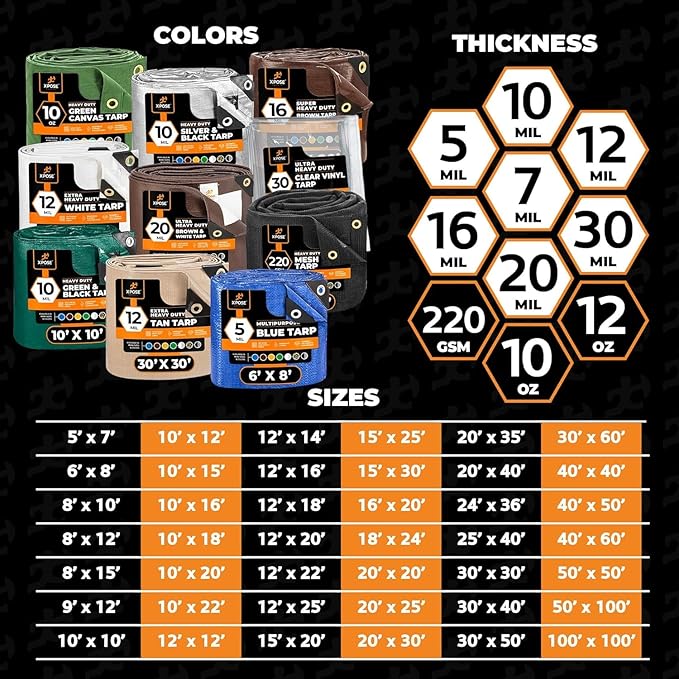 - AMAZING VERSATILITY: 38 sizes lets you cover up almost anything - perfect for camping, industrial and construction sites! FINISHED SIZE: Xpose Safety Premium Tarps Run True to Size.