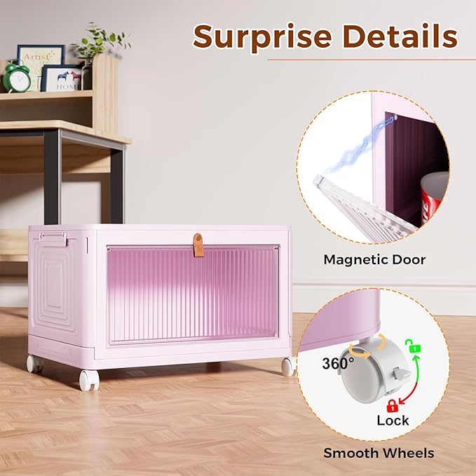 4 Tier Stackable Plastic Storage Bins with Lid and Wheels - 23 QT Closet Organizers and Foldable Storage Containers, Organization Boxes for Craft, Home, Pantry, Dorm, Pink