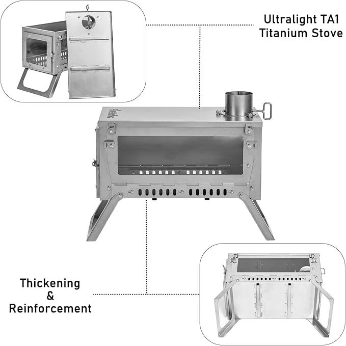 - Ultra-light Titanium Stove: The tent stove is made of thickened TA1 titanium alloy, which has the characteristics of high strength, light weight and corrosion resistance; it can be used for camping heating and cooking.