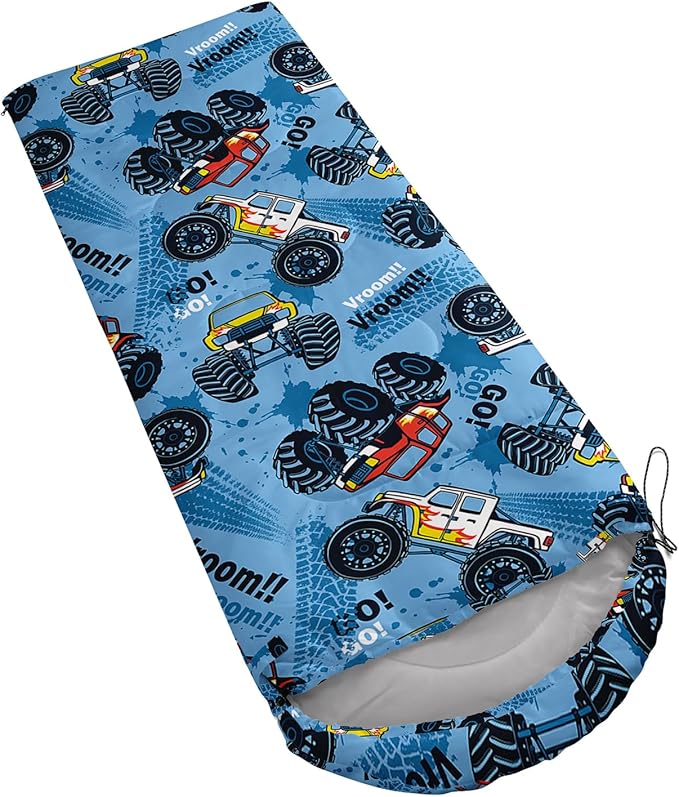 - Unique Truck Design:This Truck pattern sleeping bag is made of 3D digital printing with vibrant colors and patterns,size: 31W x 90L inches,temperature range: 32℉-77℉ (0℃-25℃),it also also have a weather resistant waterproof design to keep you warm and prevent you from any dampness,can be used in 3 seasons