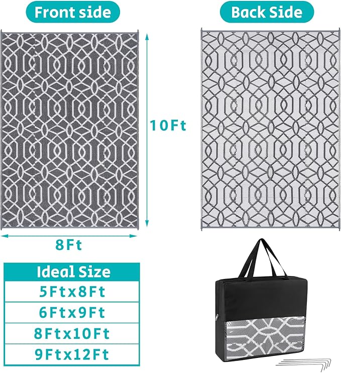 - Reversible Outdoor Rugs: Featuring a classic moroccan pattern on both sides, this 8x10 ft outdoor area rug allows you to instantly refresh your patio, porch, backyard, deck, RV campsite. And this outdoor deck rug is reversible, two-sided design allows you to have two different looks,both sides can blend perfectly with nature and look very full and comfortable.
