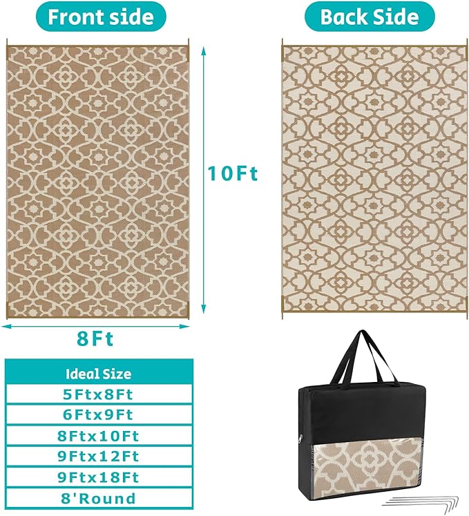 • Versatile Outdoor Carpet: The indoor outdoor plastic rugs have multiple choice in different colors(4'x6',5'x8',6'x9',8'x10',9'x12',9'x18',8'round), is ideal for a variety of indoor outdoor activities,like patio mat, deck rug, garden rug, beach mat, picnic mat, BBQ party mat, rv camping rug,pool rug,outdoor doormat,garage rug,front door mat,allowing you to have plenty of imaginable space for more fun.
