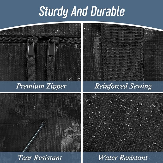 12 Pack Extra Heavy Duty Large Moving Bags with Strong Zipper & Comfortable Handles, Sturdy & Durable Clothes Storage Bags Totes Bins, Packing Moving Boxes for College Supplies, Black