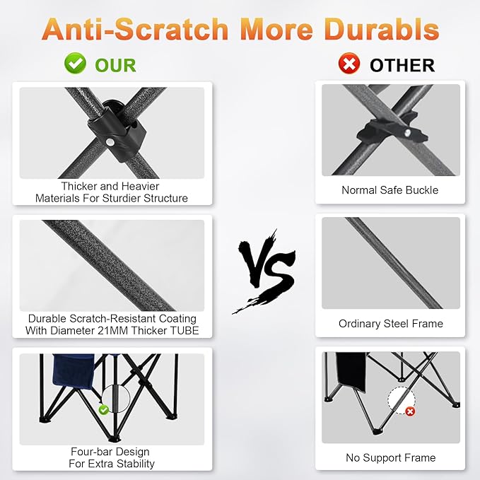 - Heavy Duty Camping Chair: Our Xl camping chair open dimension 22.8" L x 38.5" W x 40.9"H and it with more higher and more wider seat.This outdoor chair's the frame, coated with sturdy, scratch-resistant paint, is capable of supporting up to 500 lbs.Additionally, the non-slip textured feet provide a stable and secure seating experience