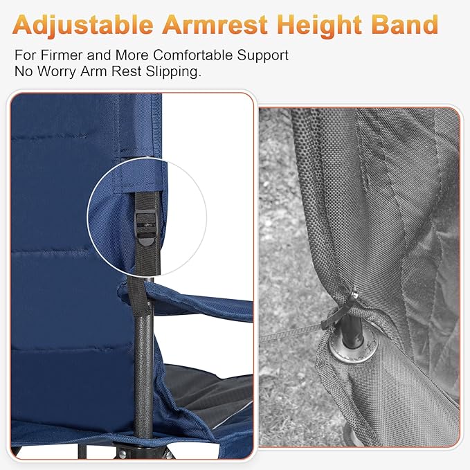 - Adjustable Elastic Strap Armrests Support: Romswi oversized lawn folding chair can adjust the telescoping straps on the back to adjust the height of the chair's armrests support for more comfy position.You don't have to worry about the handles slipping off under pressure