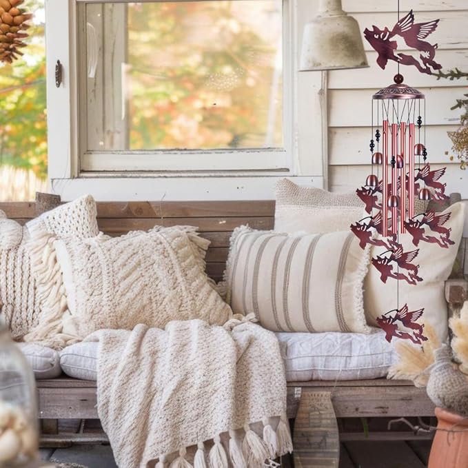 - UNIQUE DESIGN: Flying Pigs wind chimes, pure hand-made with 4 red copper durable aluminum tubes. 1 round metal caps. 7 cute pigs, 6 bells, 18 small lucky beads, 1 hook up. From the hanging ring to the bottom hanger, whole wind chimes measures 36 inches. Each metal tube has its own unique tone when it collides. Enjoy the wonderful music to soothe your body and mind. Enjoy peaceful melodies it plays. The sound is soft, clear and relaxing.