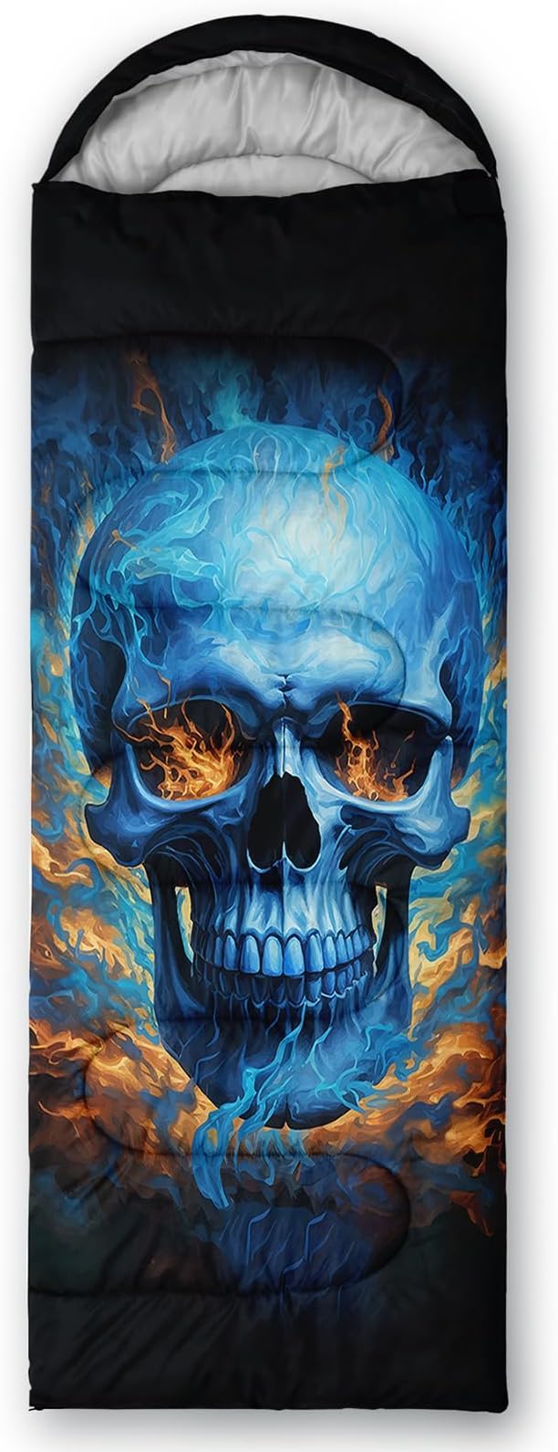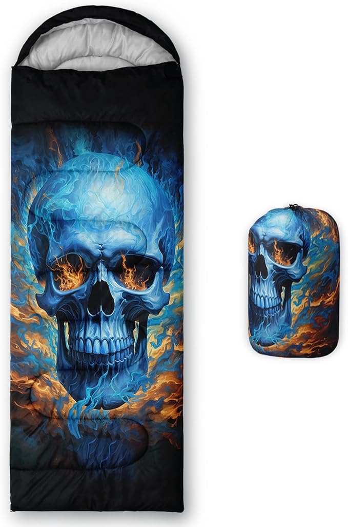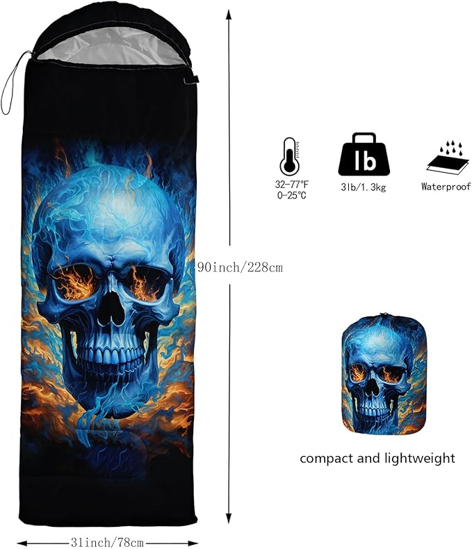 - Unique Skull Design:This Skull pattern sleeping bag is made of 3D digital printing with vibrant colors and patterns,size: 31W x 90L inches,temperature range: 32℉-77℉ (0℃-25℃),it also also have a weather resistant waterproof design to keep you warm and prevent you from any dampness,can be used in 3 seasons