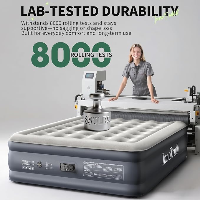 - ๐๐ง๐ซ๐ข๐ฏ๐๐ฅ๐๐ ๐๐จ๐ฆ๐๐จ๐ซ๐ญ: Enjoy quick, firm support with the InnoTruth air mattress, featuring a powerful 110V pump that inflates or deflates in just 3 minutes. The Smart Air Coil System conforms to your body's natural curves, evenly distrubuting weight to minimize sinking and relieve pressure on your back
