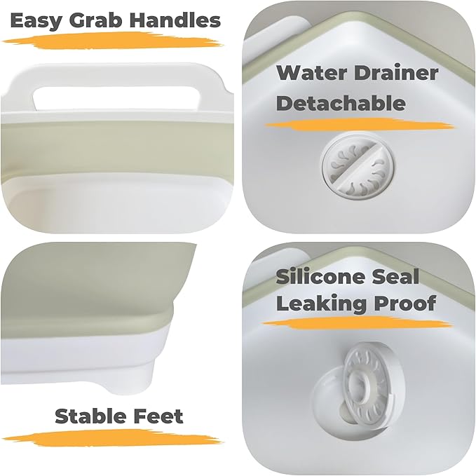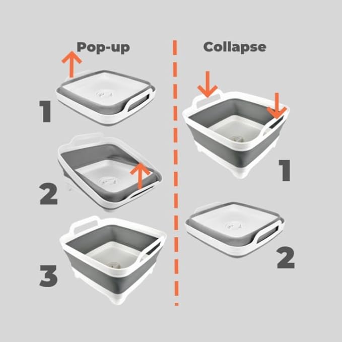 - Space-Saving & Portable: Expanding to 12 x 12 x 7.7 inches and folding to just 3 inches, this dish tub is ideal for compact sinks or other small areas. It easily folds flat for convenient storage, keeping your space tidy when not in use
