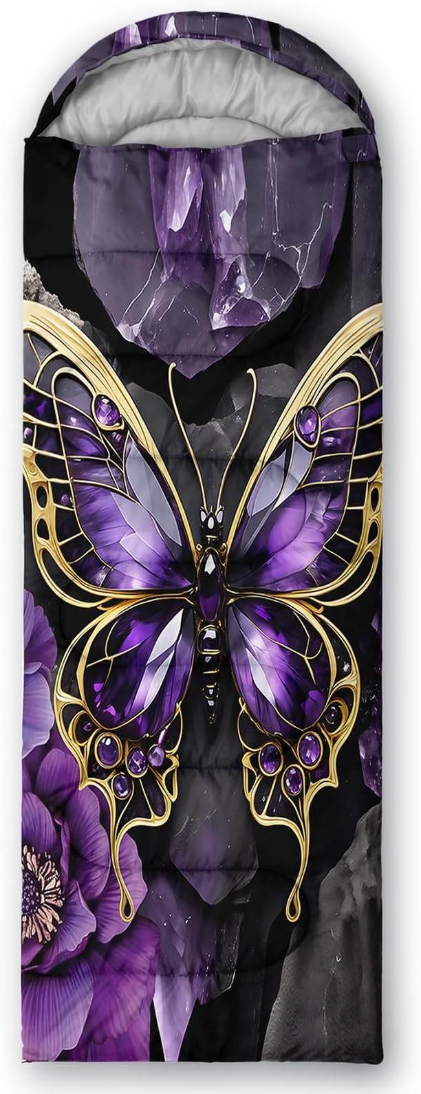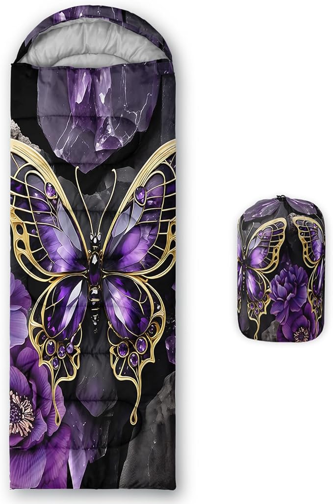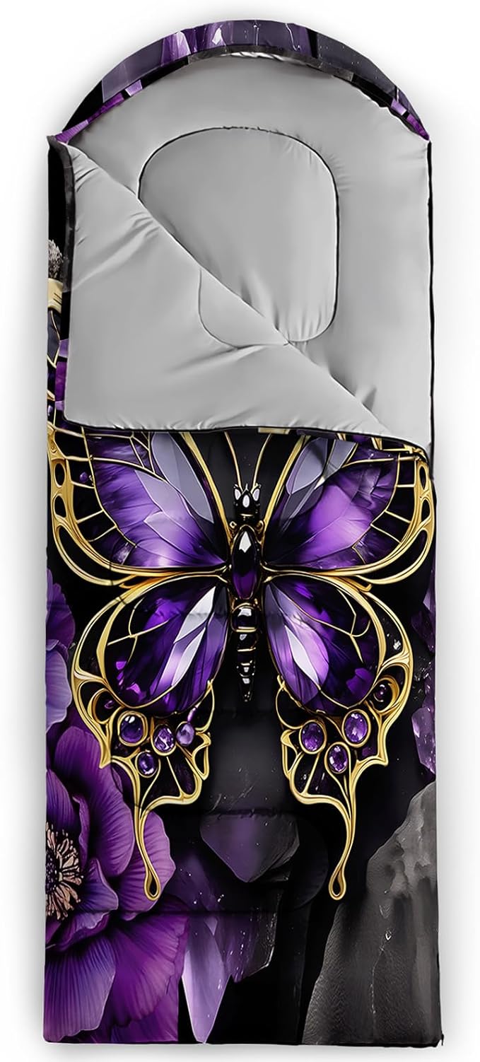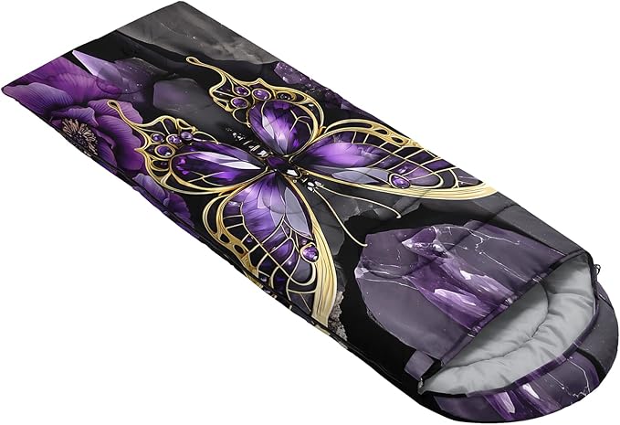 - Unique Butterfly Design:This Butterfly pattern sleeping bag is made of 3D digital printing with vibrant colors and patterns,size: 31W x 90L inches,temperature range: 32℉-77℉ (0℃-25℃),it also also have a weather resistant waterproof design to keep you warm and prevent you from any dampness,can be used in 3 seasons