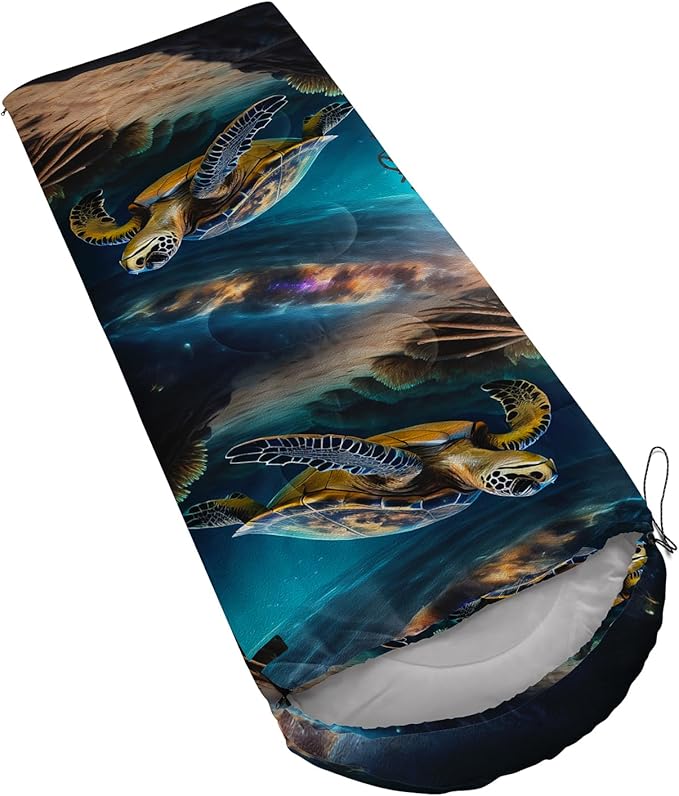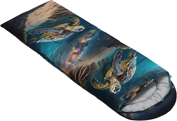 - Unique Sea Turtle Design:This Sea Turtle pattern sleeping bag is made of 3D digital printing with vibrant colors and patterns,size: 31W x 90L inches,temperature range: 32℉-77℉ (0℃-25℃),it also also have a weather resistant waterproof design to keep you warm and prevent you from any dampness,can be used in 3 seasons