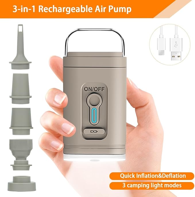 - Rechargeable Air Pump: Many customers prefer fuller mattresses, so we offer a rechargeable air pump (optional) for improved inflation and storage. It boasts a built-in battery for up to 20 uses per charge, facilitating effortless inflation/deflation. With one-button operation, it inflates/deflates in under 1 minute and includes 5 nozzles for various products like air mattresses and swimming pools. Additionally, it features a camping light mode with adjustable brightness (up to 10 hours on low).