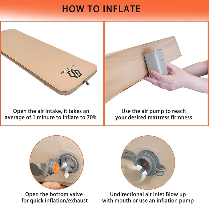- Inflatable Camping Mattress: Our self-inflating mattress can be quickly inflated by simply opening the valve, offering easy operation and effective sealing. Once the valve is fully opened, the sleeping mat will self-inflate by up to 70% within 60 seconds.