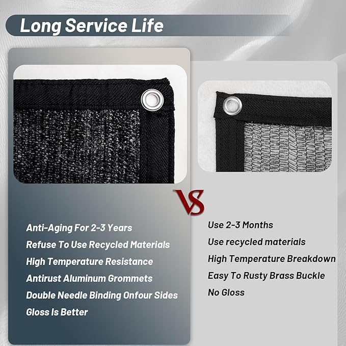 - ??0% Shading Rate?‘Made of 100% New High Density Polyethylene (HDPE) fabric material, has a shading rate up to 90% can avoiding direct sunlight while allowing free air circulation.