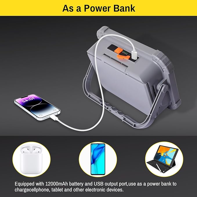 - Ultra-bright Worklight: Our work lights are equipped with 336 high-efficiency LED work light beads and 4 large foldable solar panels, providing long-lasting ultra-high brightness and optimal visibility. Built-in 12000mAh lithium battery can provide stable and bright light for up to 10 hours. (Please fully charge before using for the first time)