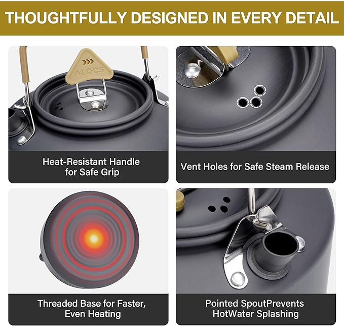 - FOOD GRADE SAFETY - The Alocs camping coffee pot is crafted from durable, food-grade hard anodized aluminum, offering rapid heat conduction, high-temperature resistance, corrosion resistance, and rust-proof properties. The camping kettle is more durable and stable than ordinary kettles.