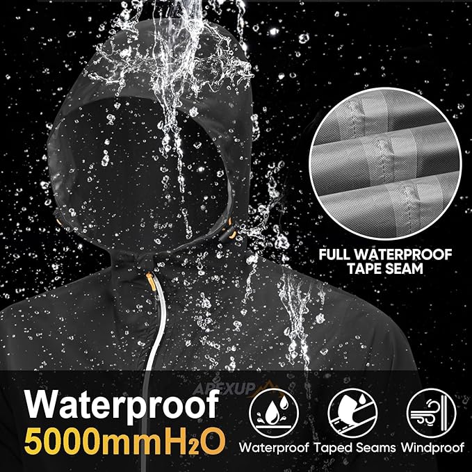 - Waterproof and Windproof: APEXUP men's rain jacket is made from tear-resistant, high-density polyester with waterproof zippers; It features a premium waterproof coating and hot-pressing sealed seams, ensuring a 5000-8000mm waterproof rating to keep you dry in any weather