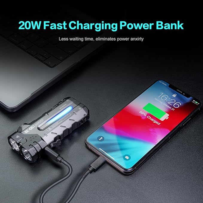 - 20-Day Power Bank Flashlight - Dual batteries provide 20+ days runtime & 8000mAh emergency charging. 20W USB-C fast charge juices phones in camping/hiking. Keeps your adventure rolling.