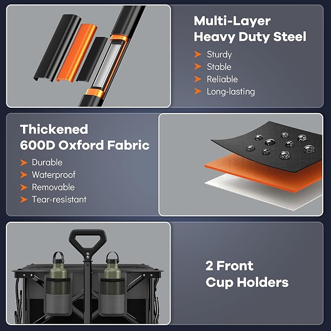 - ใ๐ฐ๐ฒ๐ฌ๐๐ ๐ช๐ฒ๐ถ๐ด๐ต๐ ๐๐ฎ๐ฝ๐ฎ๐ฐ๐ถ๐๐ ๐๐ฒ๐ฎ๐๐ ๐๐๐๐ ๐จ๐๐ถ๐น๐ถ๐๐ ๐ช๐ฎ๐ด๐ผ๐ป ๐๐ฎ๐ฟ๐๐ ๐๐ถ๐๐ต ๐ฆ๐๐๐ฟ๐ฑ๐ ๐๐ถ๐ด๐ต-๐๐๐ฟ๐ฒ๐ป๐ด๐๐ต ๐๐น๐น-๐บ๐ฒ๐๐ฎ๐น ๐๐ฟ๐ฎ๐บ๐ฒใOur outdoor collapsible cart is made of solid mental frame, 20% thicker than other carts. Featuring innovative structural design, static load capacity up to 460lb and dynamic load capacity up to 330lb, ideal for grocery, shopping, camping, garden, sports, travel. With double-layer thickened durable 600D Oxford fabric, waterproof, wear-resistant and tear-resistant, ensuring stable support for all your gear.