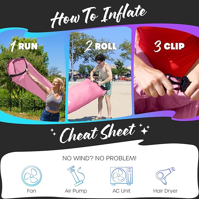 - Wind Optional Set Up: Setting up the Nevlers Bubblegum Pink Inflatable Sofa is as easy as 1-2-3! Simply run a few feet, roll it up, then clip it to have your inflatable furniture ready in no time. No wind? No worries! Even if there's no breeze, you can use a fan or air pump to inflate this air chair . When it's time to pack up, deflate & fold the portable beach chair into the drawstring bag for lightweight storage. No need to lug around bulky seating with our inflatable lounge chair .
