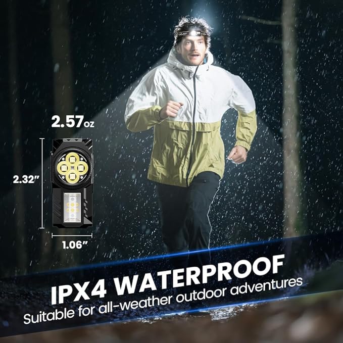 - IPX4 Weatherproof + 6 Light Modes:Resists rain/snow for 90% outdoor scenarios . Switch between strong/weak beams, red light, and SOS—optimized for trails, reading, or storms.