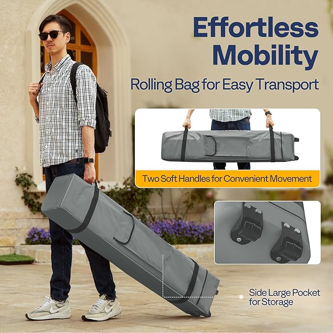 - EASY TRANSPORT: The roller bag, made of 300 x 600D Oxford cloth, comes with 2 casters, 2 robust base feet, and 2 soft handles, which is portable for your on-the-go lifestyle; Designed with practicality in mind, the storage bag features a large pocket on the side; Keep ground nails and ropes organized before installation or pack essentials like snacks, drinks, or books for your outdoor leisure; Whether camping, hiking, or beach-bound, this pop-up tent will be your ideal companion