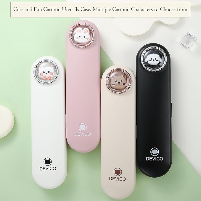 DEVICO Travel Utensils with Case Cute, Reusable Silverware for Lunch, Portable Cutlery Set, 18/8 Stainless Steel Fork Spoon Chopsticks in Cartoon Case, Dishwasher Safe (White)