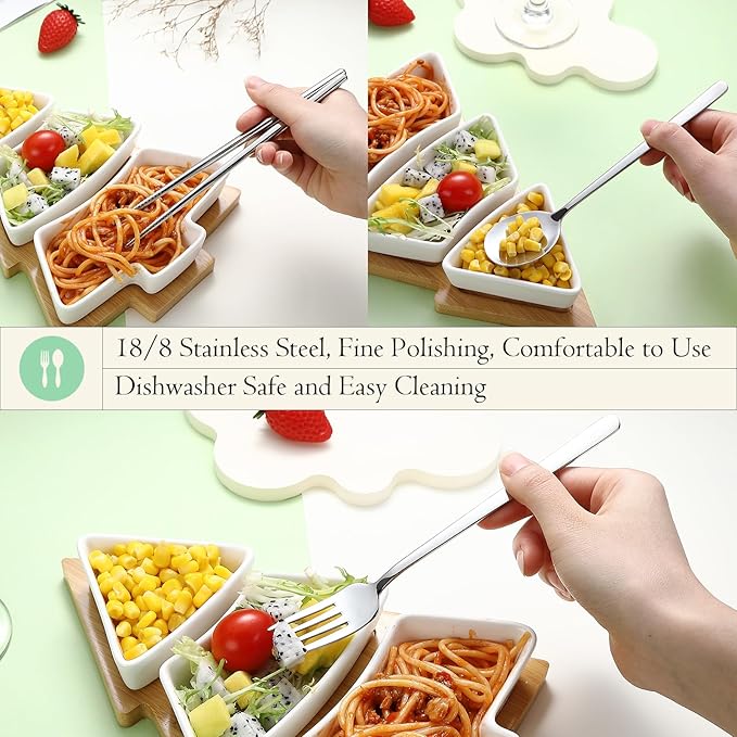 - 3. Say goodbye to disposable flatware, the reusable silverware are made of food grade 18/8 stainless steel (SUS 304). Durable and sturdy, rust resistant, easy to clean, dishwasher safe