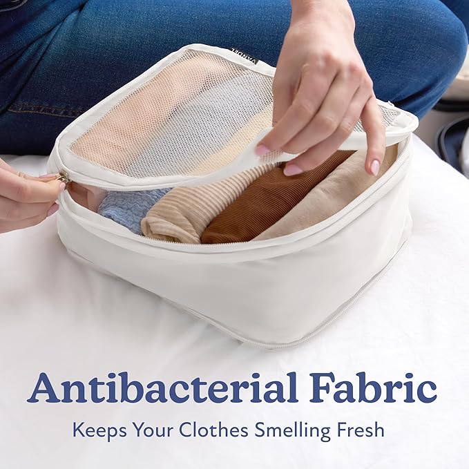 - Fabric - Made from fabric that’s infused with silver ions, these packing cubes for travel will always smell fresh; The breathable mesh design keeps clothing fresh and compact