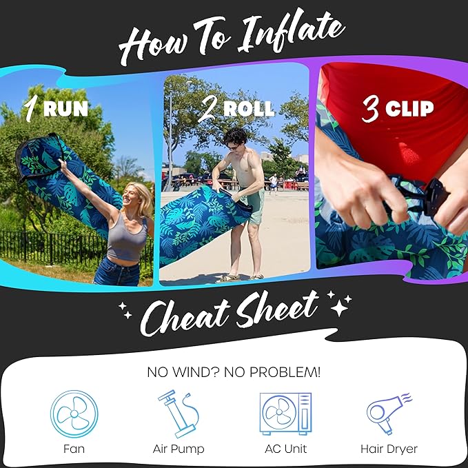 - QUICK INFLATION WITH NO PUMP REQUIRED: Skip the bulky seating & set up the Nevlers Blow Up Chair in minutes. Simply run, scoop air, then clip to create a sturdy camping couch style lounger that stays comfortable for up to 6 hours. No wind? No problem! On calm days, easily fill your air sofa inflatable couch with a fan, air pump, or hair dryer. The perfect blow up couch for camping & hiking, this easy-to-use inflatable hammock lets you relax anywhere without the hassle of electricity or tools.