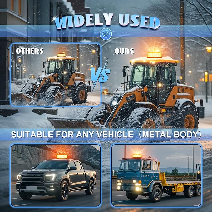 - WIDELY APPLICABLE:The safety lights for vehiclescan be adapted to all vehicles with 12-24V cigarette lighter plugs and metal bodies. This emergency amber strobe lights is widely used in postal service,construction vehicles,emergency vehicles,trailers,forklifts,tractors,snow plows,pickup trucks,school buses, etc