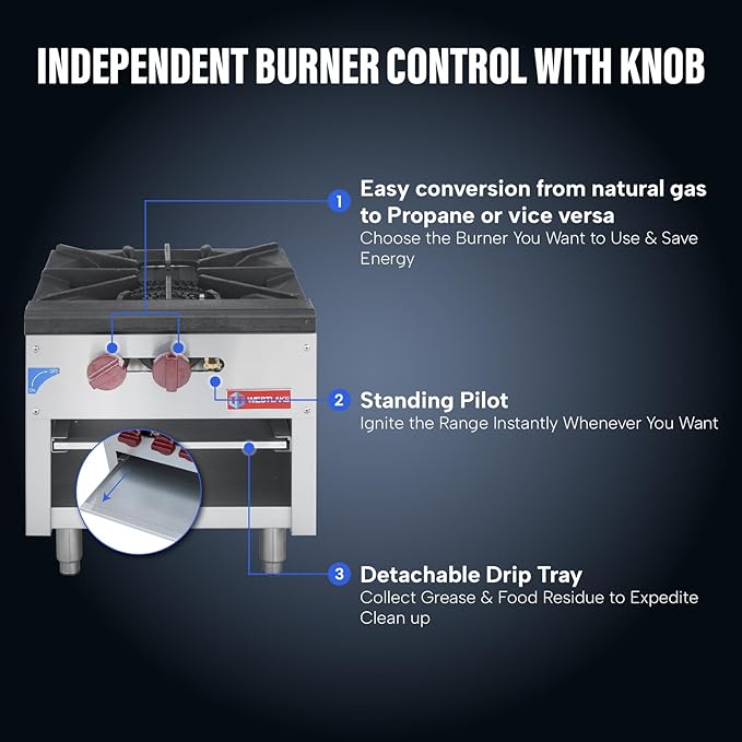WESTLAKE Commercial Gas Stock Pot Range, Single Burner Natural Gas and Propane Stove with 80000 BTU, 18" W Countertop Cooking Stove Range Commercial Stainless Steel Gas Stock Pot for Restaurant