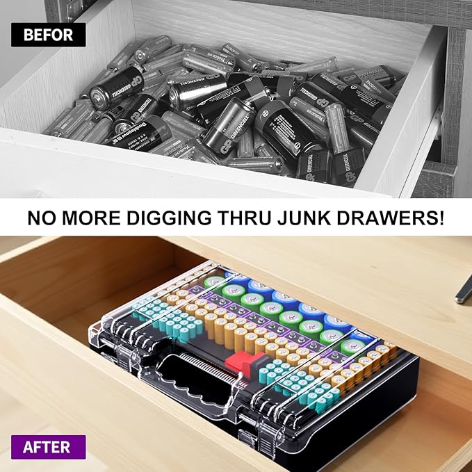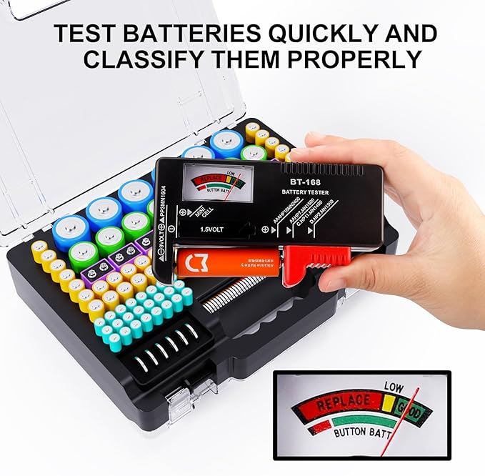- Built-in battery tester BT-168: Battery storage box built-in battery tester can quickly test batteries and classify them correctly, and you will never have to worry about finding the battery you want again. Using the battery storage case, you can easily distinguish which ones are full, which ones are low, and which ones need to be replaced.