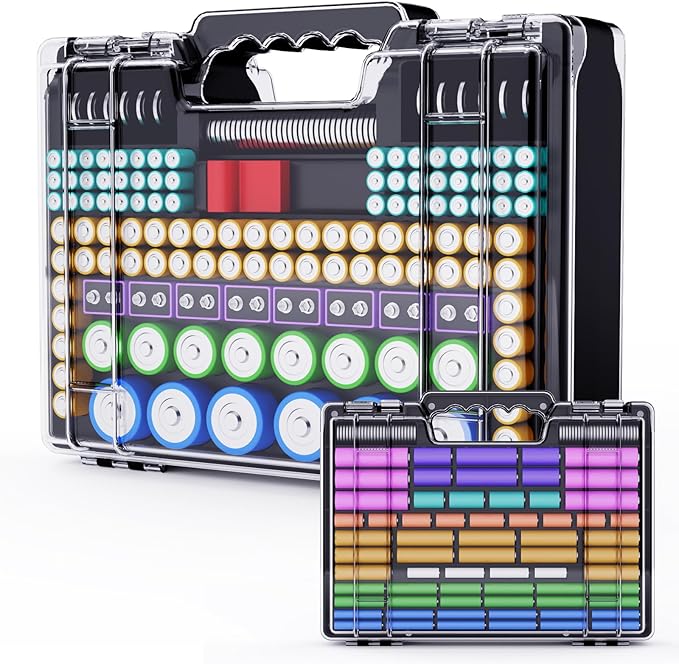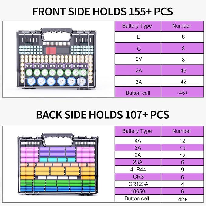 - Multiple sizes of battery slots: The battery storage box has a large capacity and is compatible with multiple battery models, every battery can find its home. The two sides of the battery storage box are designed as follows:: A-face: D*6, C*8, 9V*8, 2A*46, 3A*42, Button cell*45, BT-168*1; B-face: 4A*12, 3A*10, 2A*12, 23A*6, 4LR44*9, CR3*6, CR123A*4, 18650*6, Button cell*42.