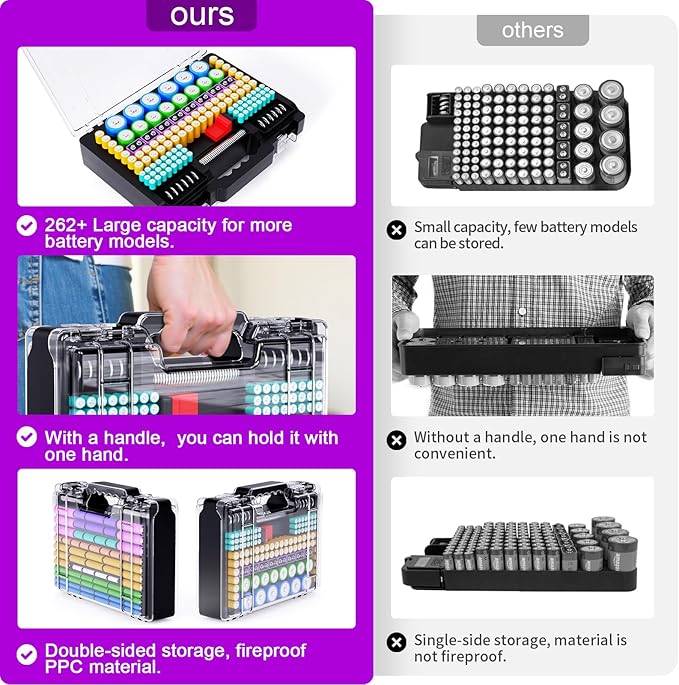 - Double sided & large capacity: Tututry battery storage organizer is designed for double-sided storage, and every inch of its space is fully utilized, so that the battery storage box has a large capacity, which can accommodate 262+ different types of batteries, and also a BT-168 tester is built in.