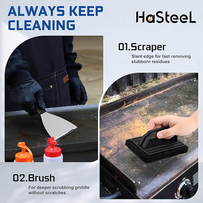 - [Professional Material] - HaSteeL griddle accessories are made of food grade stainless steel, very resistant to corrosion, heat and rust than others, Reaches 1.2mm thickness heavy duty construction can stand up frequent use, Will not react with food and shed toxic substances, Non-stick matte finish prevents sticking and fast release stuff, Easy to clean and dishwasher safe exclude burger press