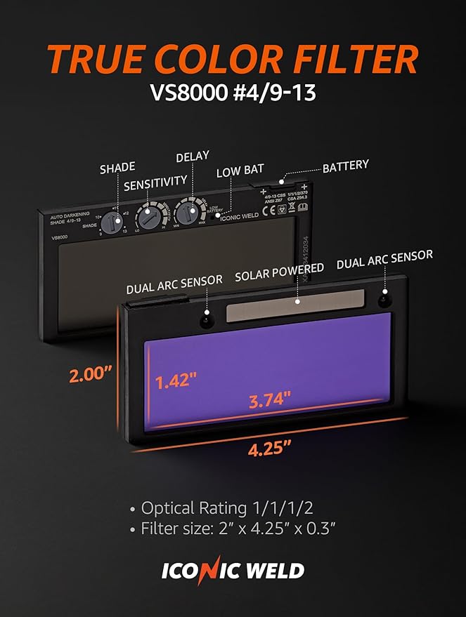 - Auto-Darkening Filter Options: Choose between VS6000 (fixed #3/11) or VS8000 (variable #4/9–13) cartridges with true color clarity and fast switching.