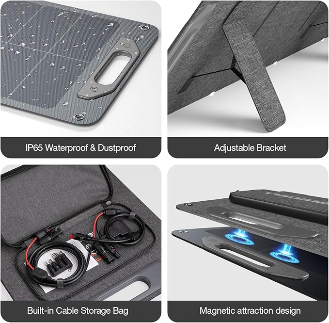 - DURABLE & OUTDOOR READY - Made from waterproof Oxford cloth and protected by a durable ETFE lamination layer, the panel is dustproof, heat-resistant, and built to withstand tough outdoor conditions. It's perfect for camping, hiking, RVs, boats, and unexpected power outages.
