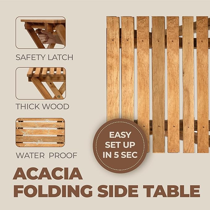- DURABLE CONSTRUCTION: Crafted from Solid Vietnamese Acacia wood, this outdoor folding side table can support up to 50-60 pounds. Equipped with two sturdy locking mechanisms underneath the tabletop, the table offers excellent stability. Ideal for supporting medium-sized plant pots, making it a versatile addition to any outdoor space.