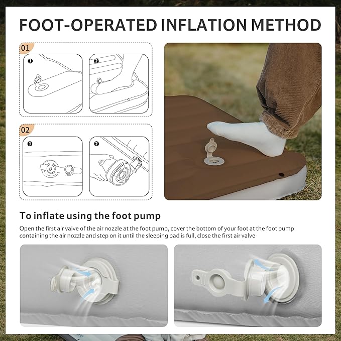 - FOOT PUMP FAST INFLATION: Inflatable Sleeping Pad uses a patented dual-pass valve, the first layer of air is not afraid of leakage, the second layer of rapid deflation to free your hands. The built-in pump allows you to simply step on the foot press can be quickly inflated within a minute, with the convenience of use